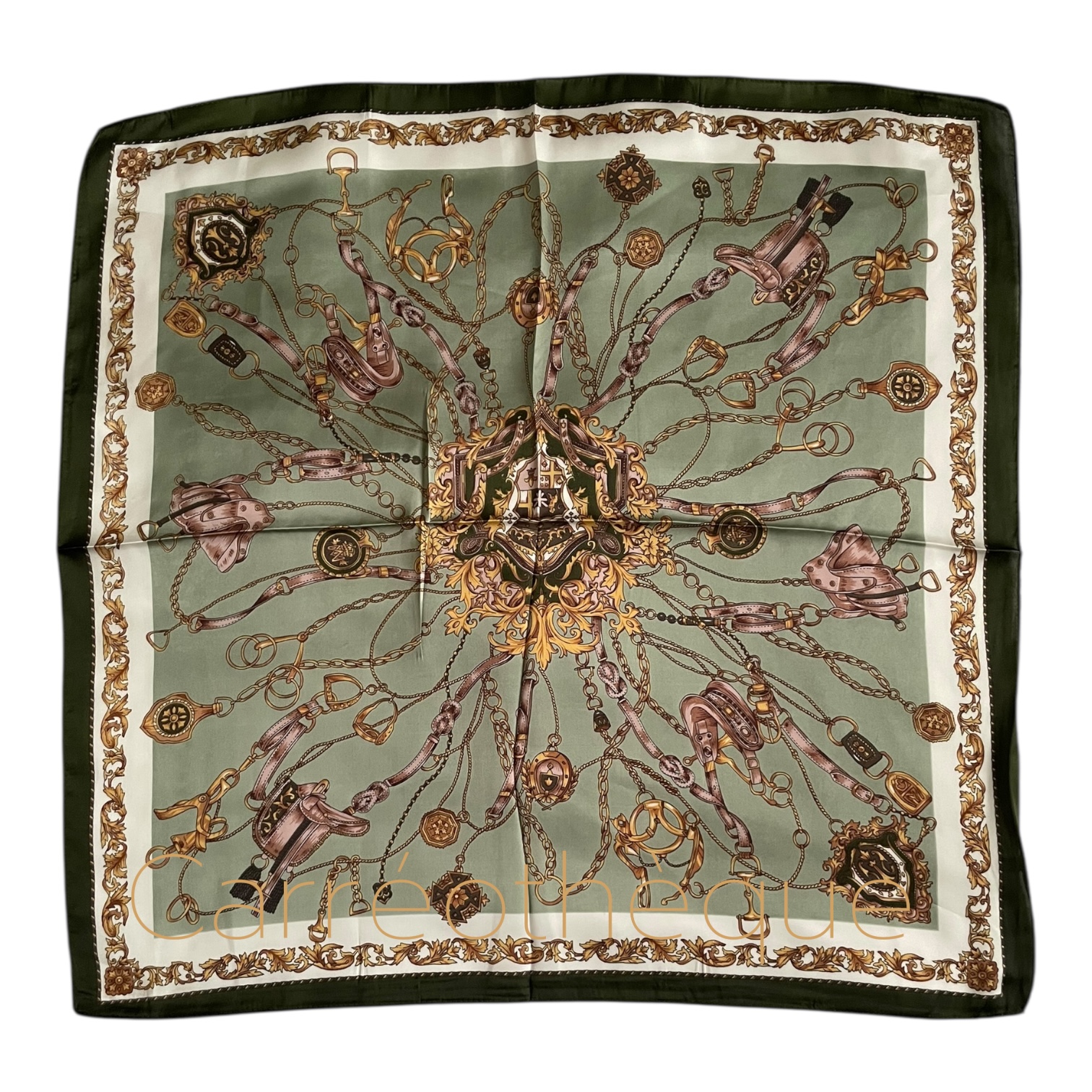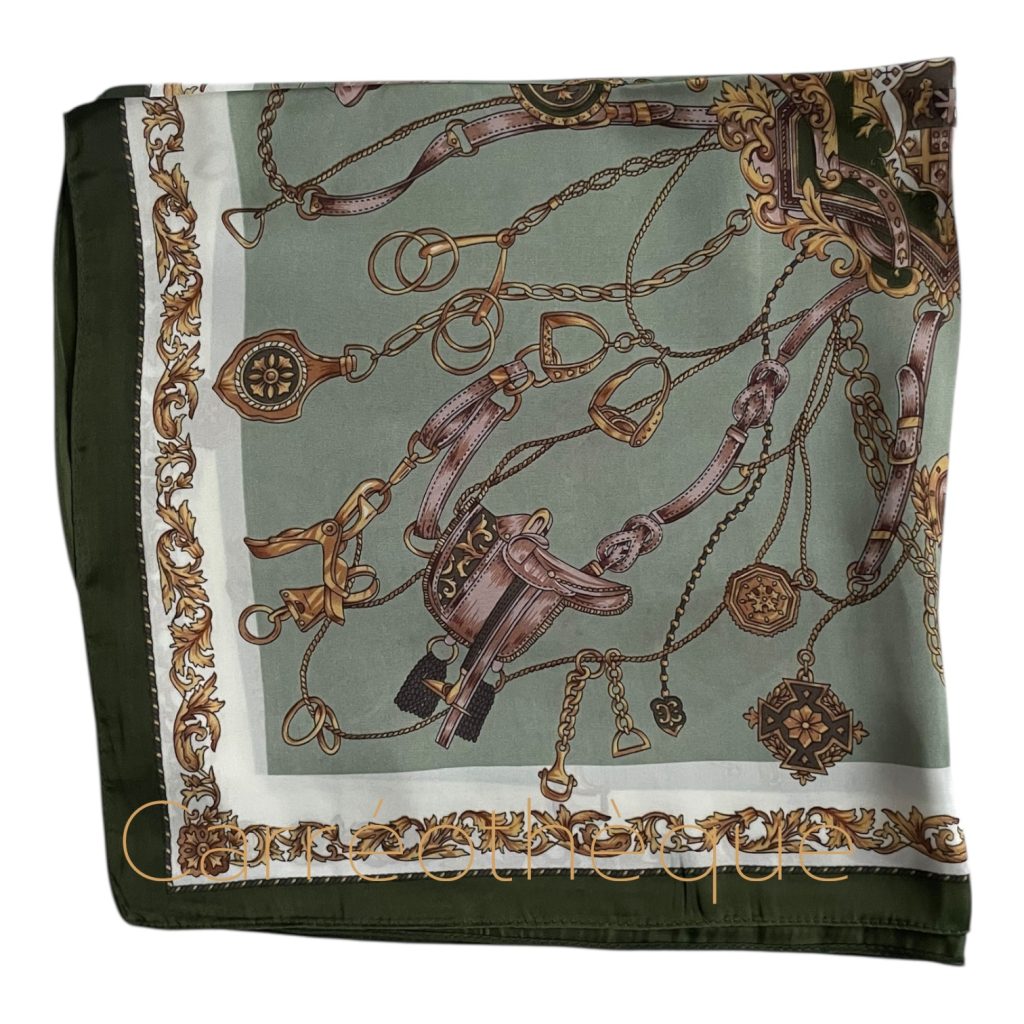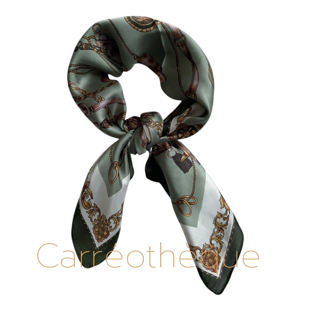 Carré 70 brides équestres vert, classique élégant intemporel.