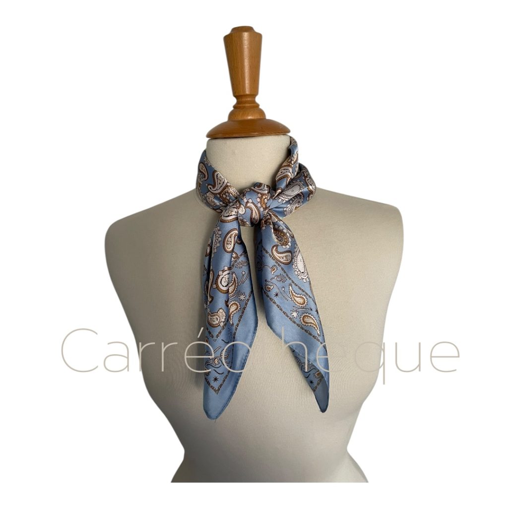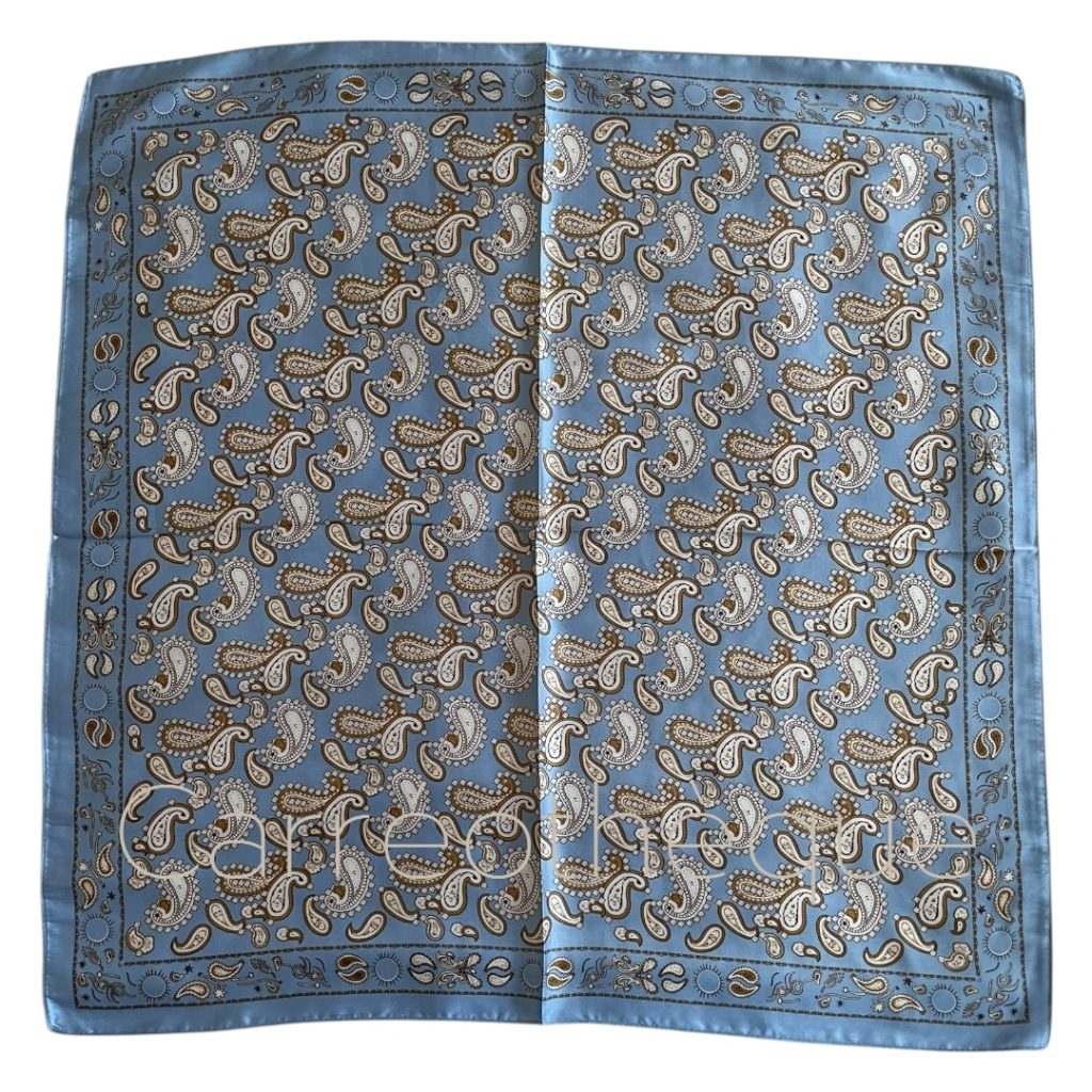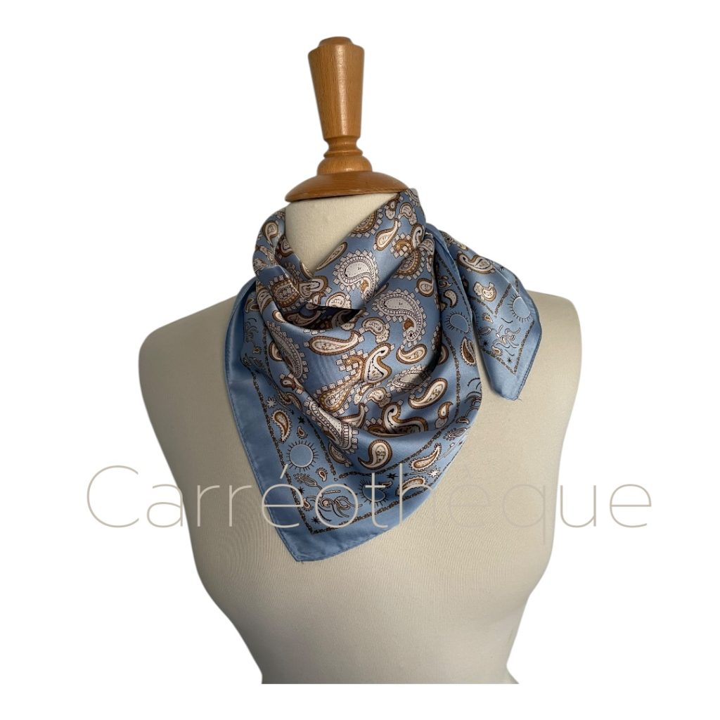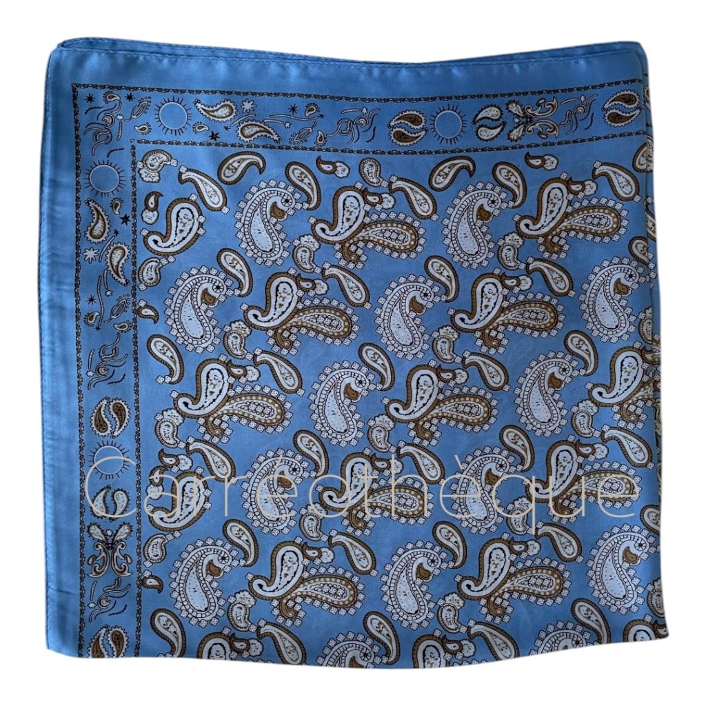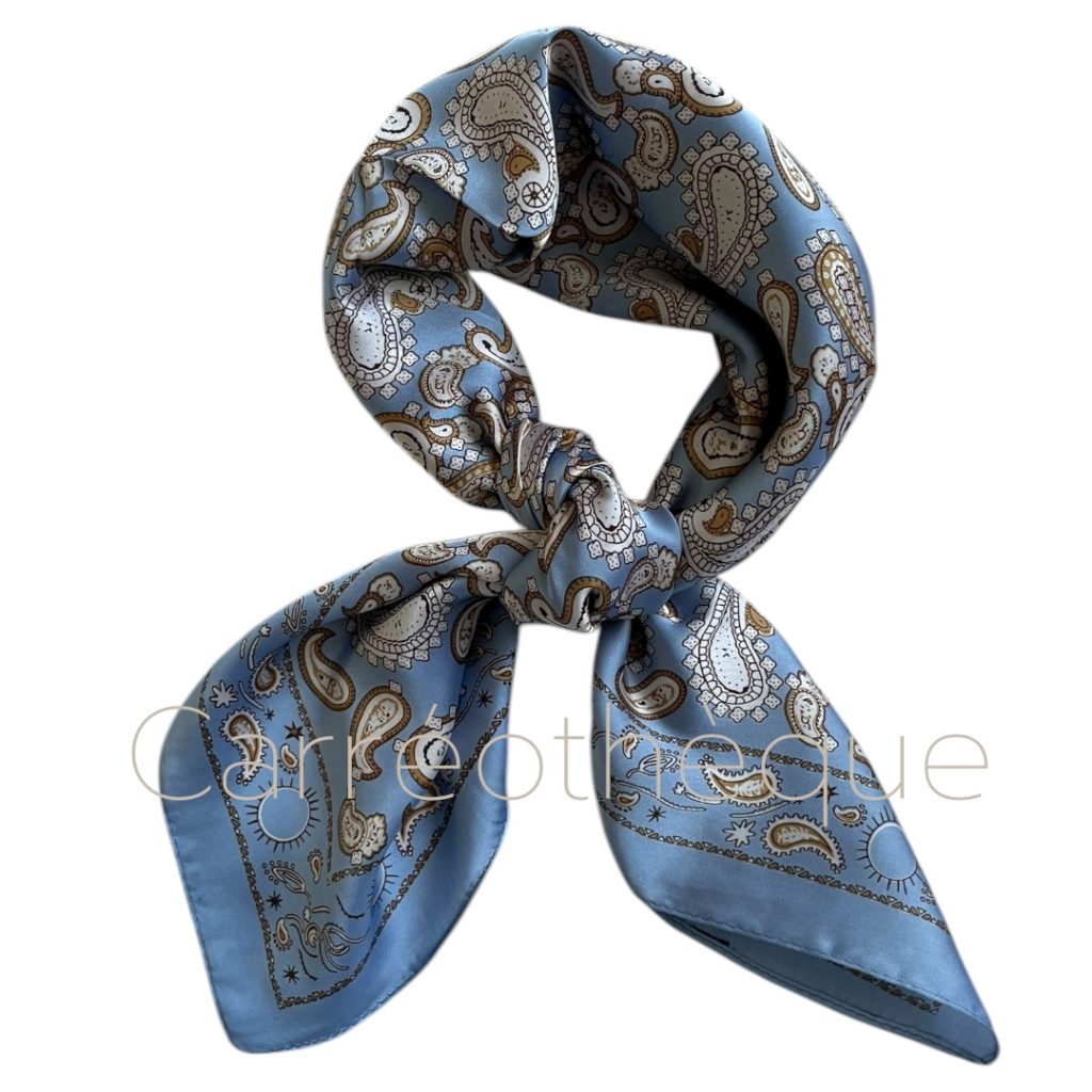 Carré 70 cachemire bleu pastel dessin jaune moutarde et blanc. Mixte intemporel.