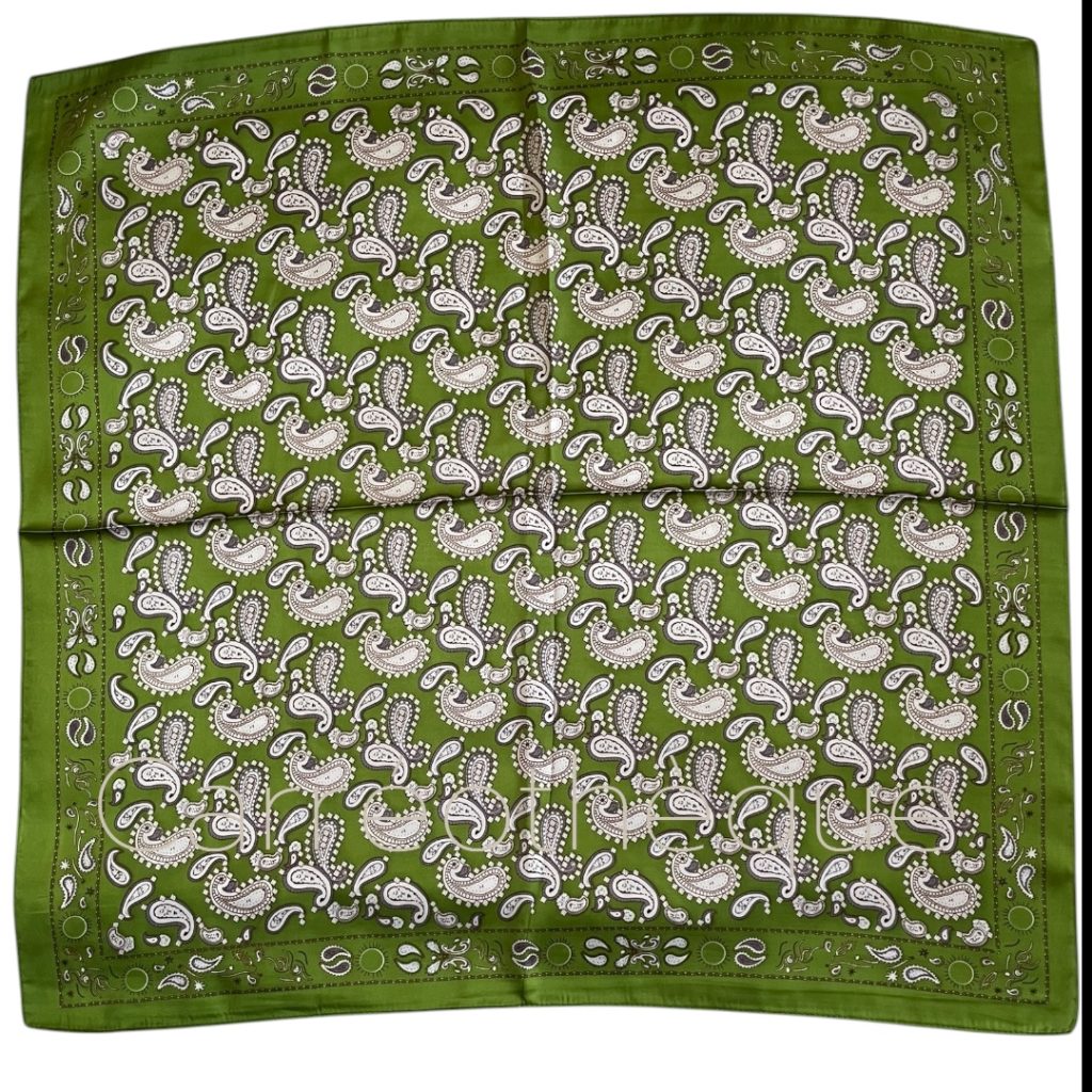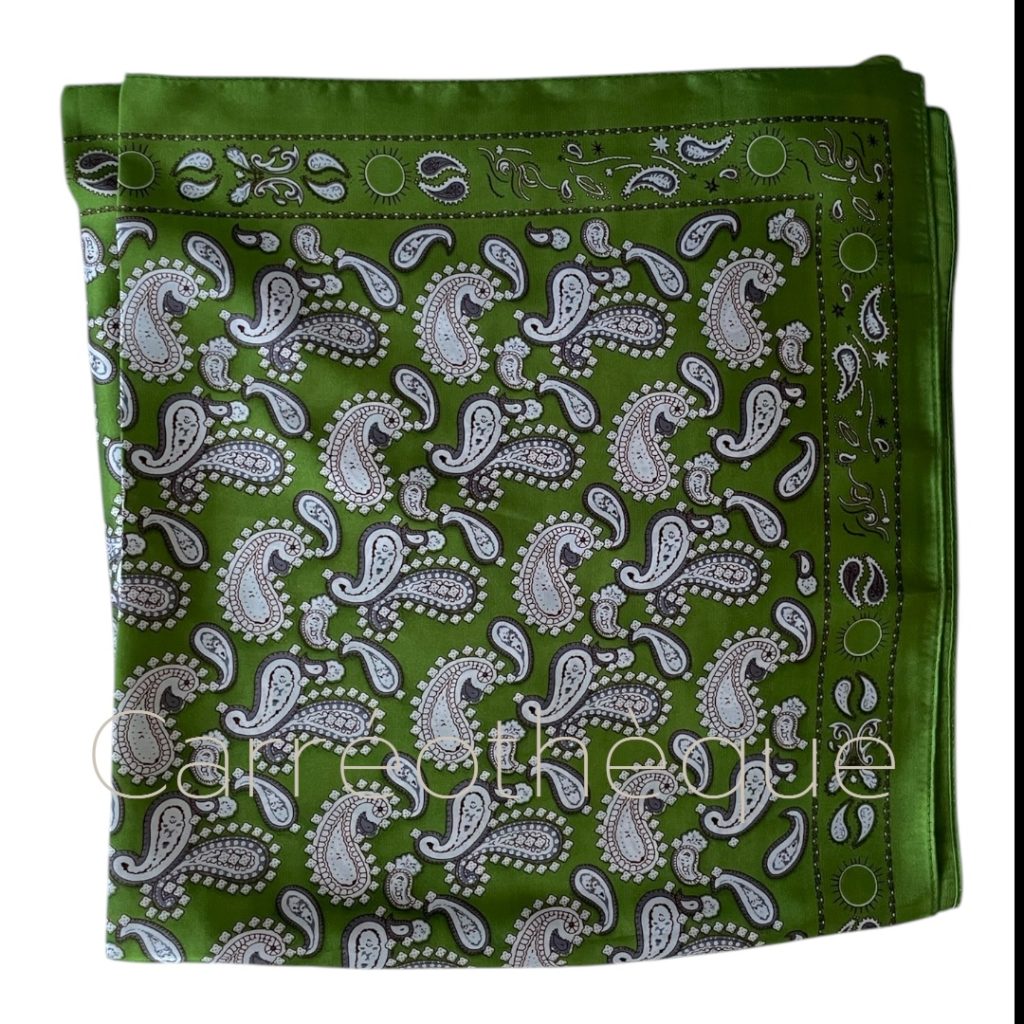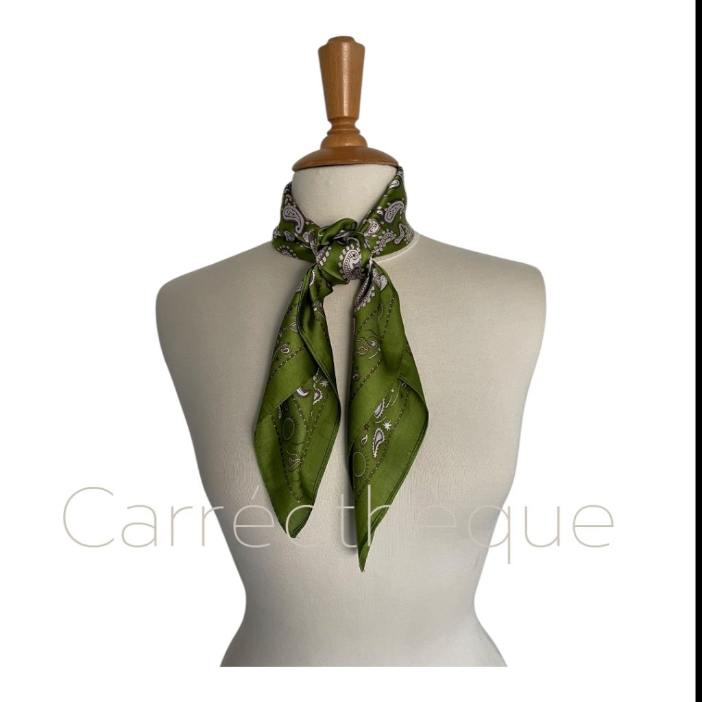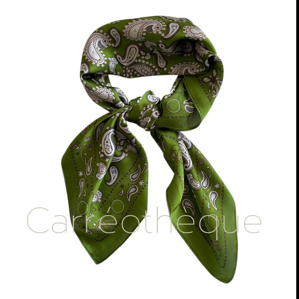 Carré 70 cachemire kaki lime dessin gris et blanc. Mixte intemporel.