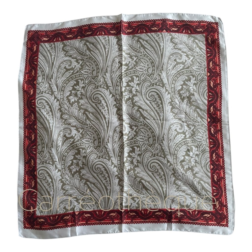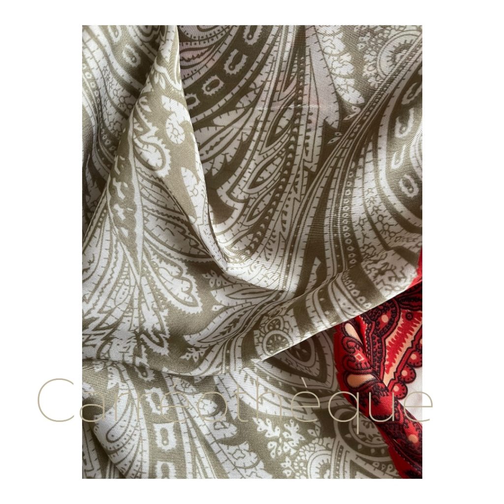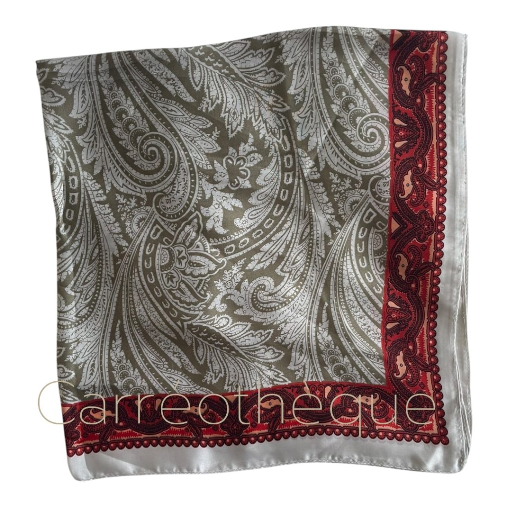 Carré 70 cachemire kaki tour rouge fond blanc crème