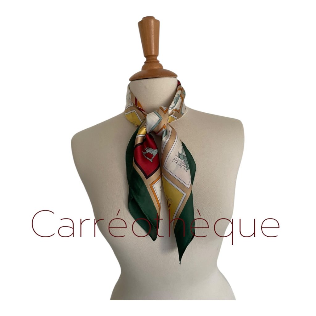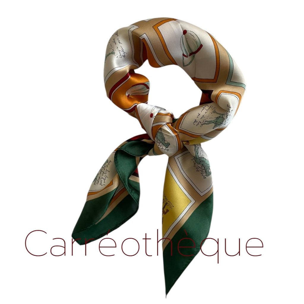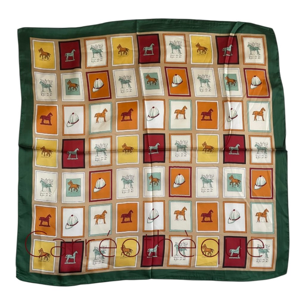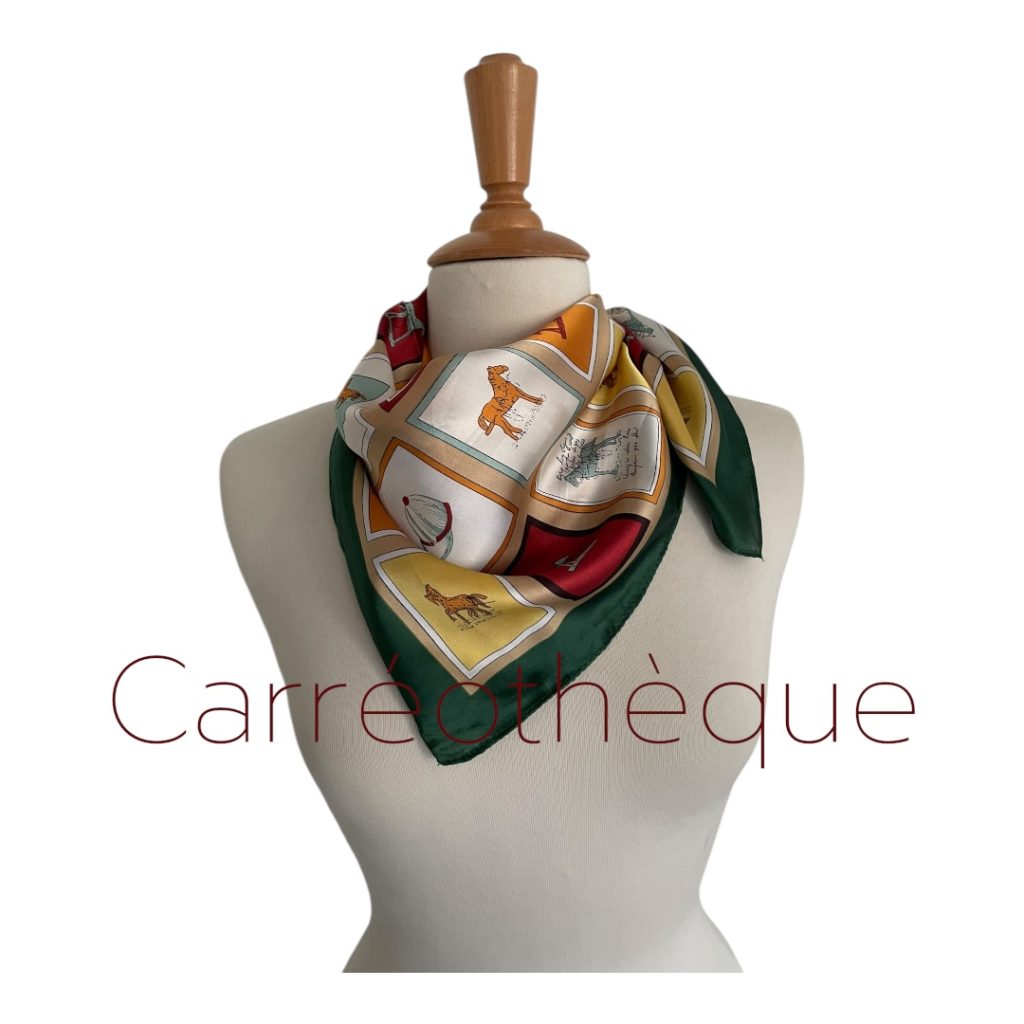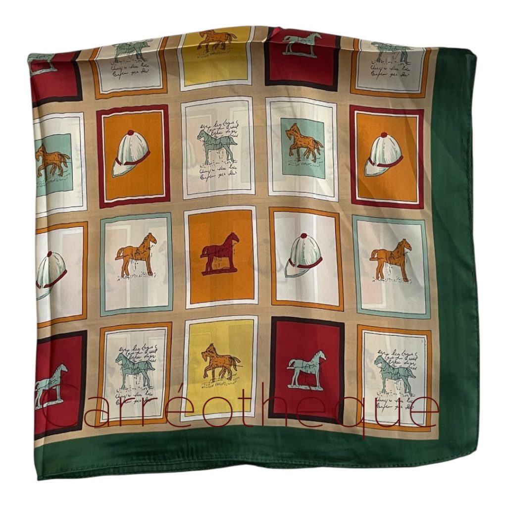 Carré 70 thème équestre représentant des carreaux avec des chevaux ou accessoires équestres tour vert, classique élégant intemporel.