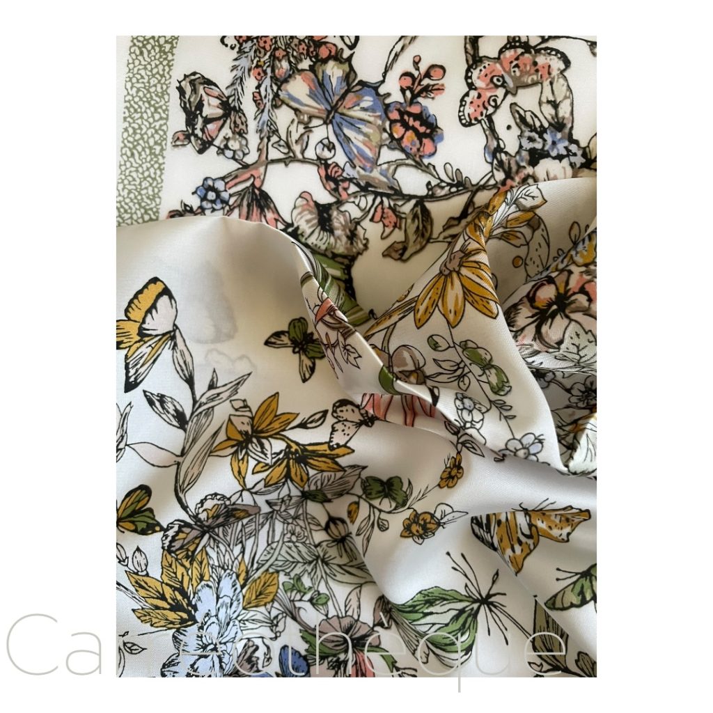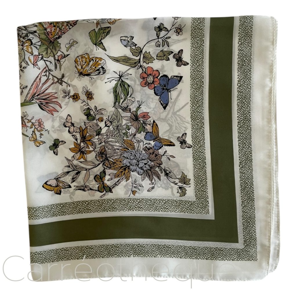 Carré 70x70cm motif dessin botanique fleurs papillons vert