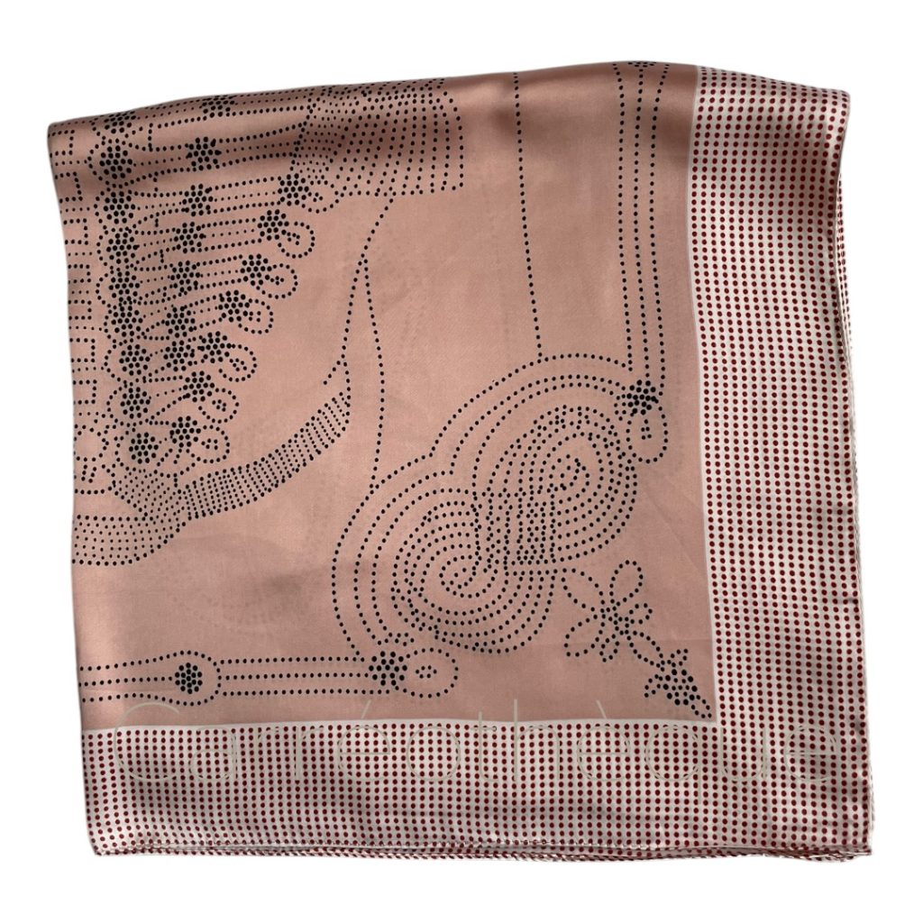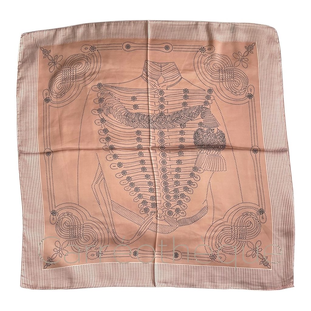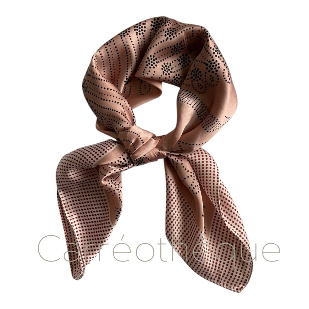 Carré 70x70cm motif équestre costumé de cavalier d’infanterie dessiné avec des pois teintes marron beige rose.