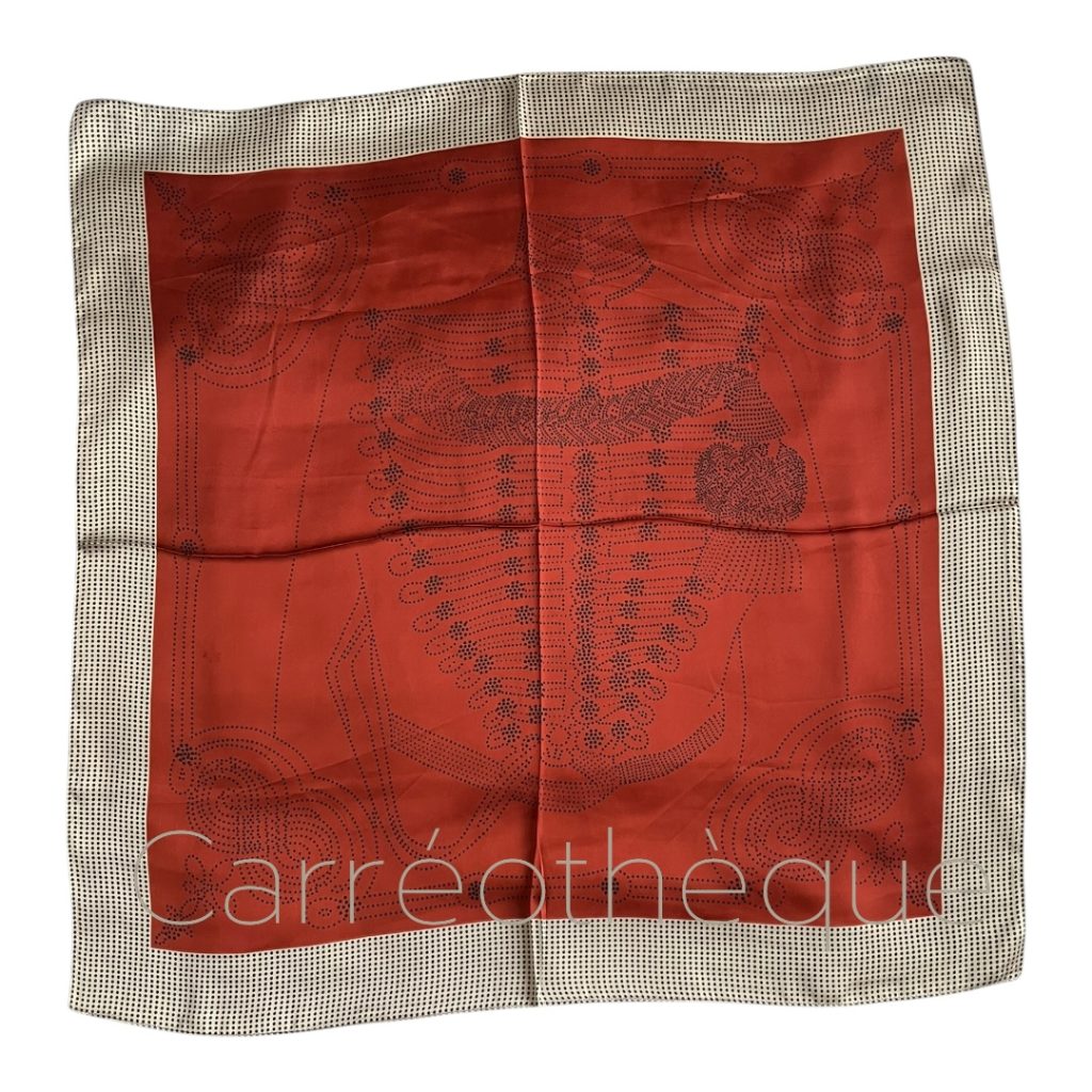 Carré 70x70cm motif équestre costumé de cavalier d’infanterie dessiné avec des pois teintes marron brun.