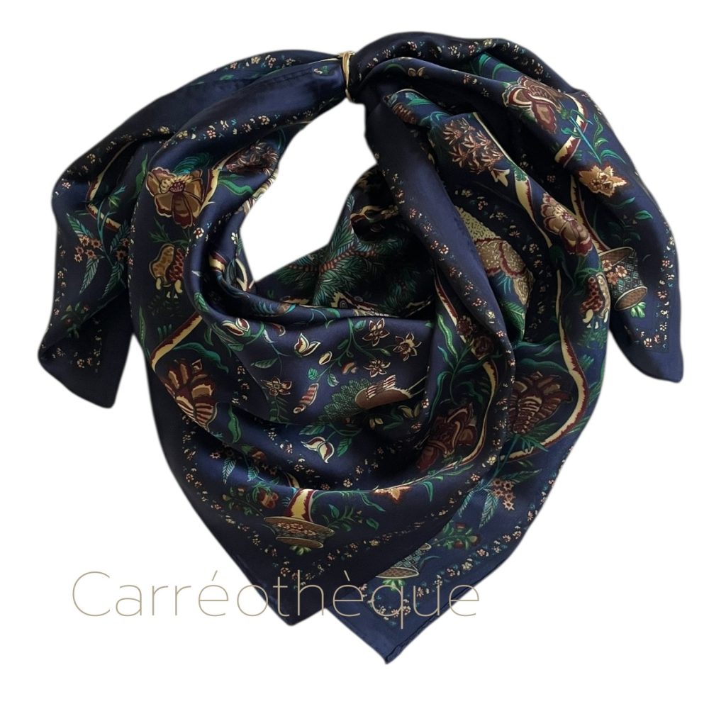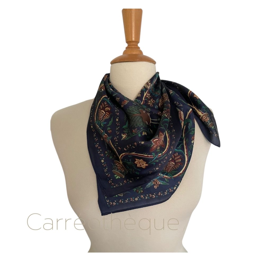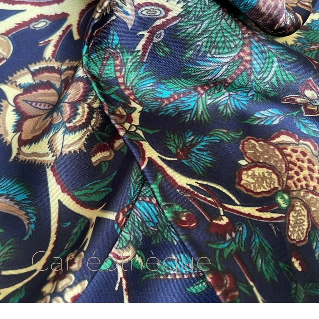 Carré 70 motif fleurs inspirées des dessin du cachemire provençal et oiseaux du paradis, paon contemporain et féminin.