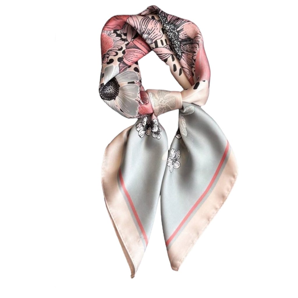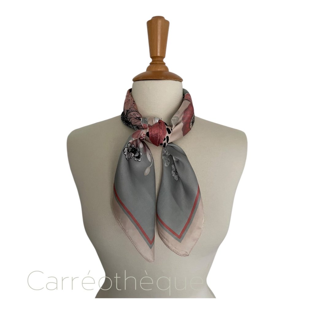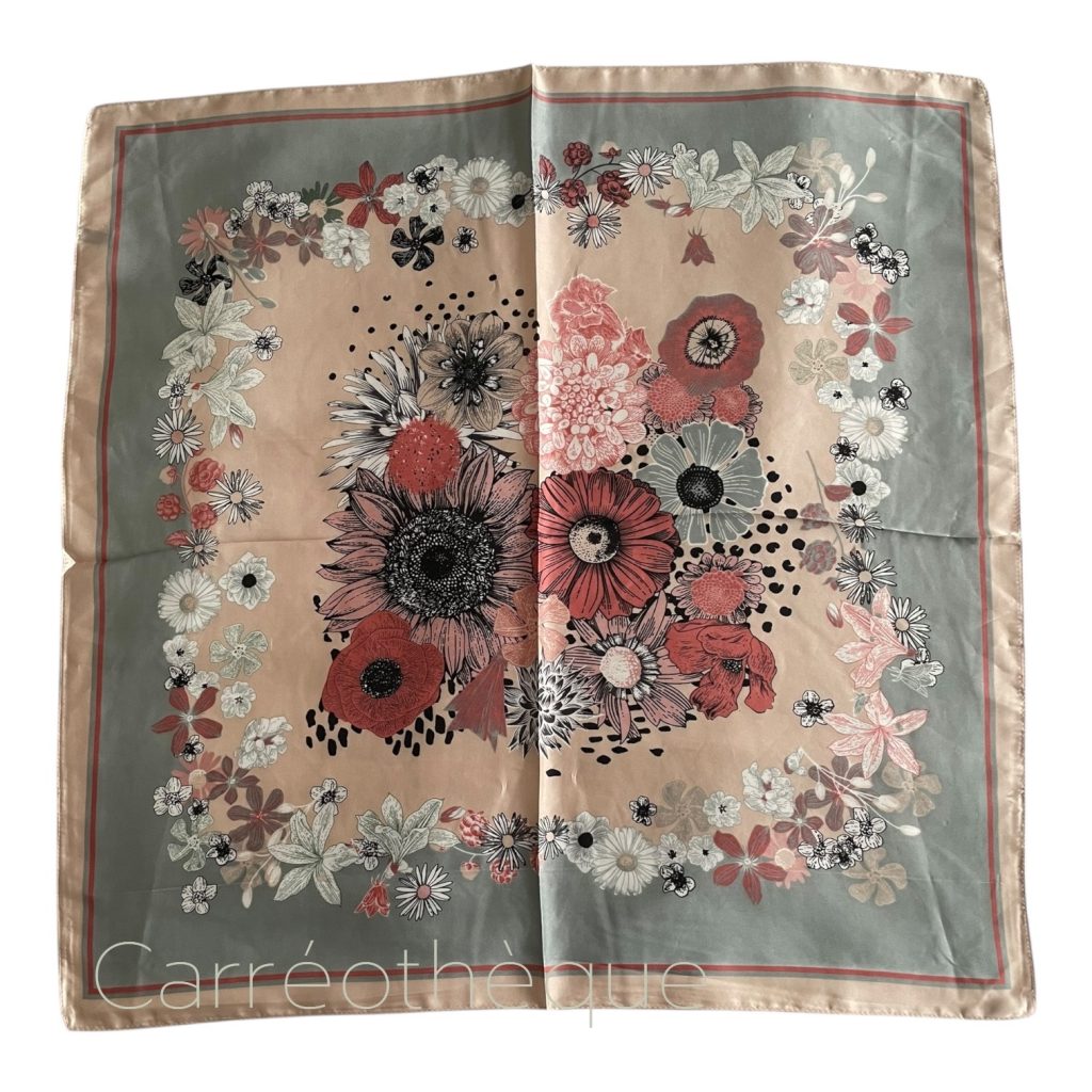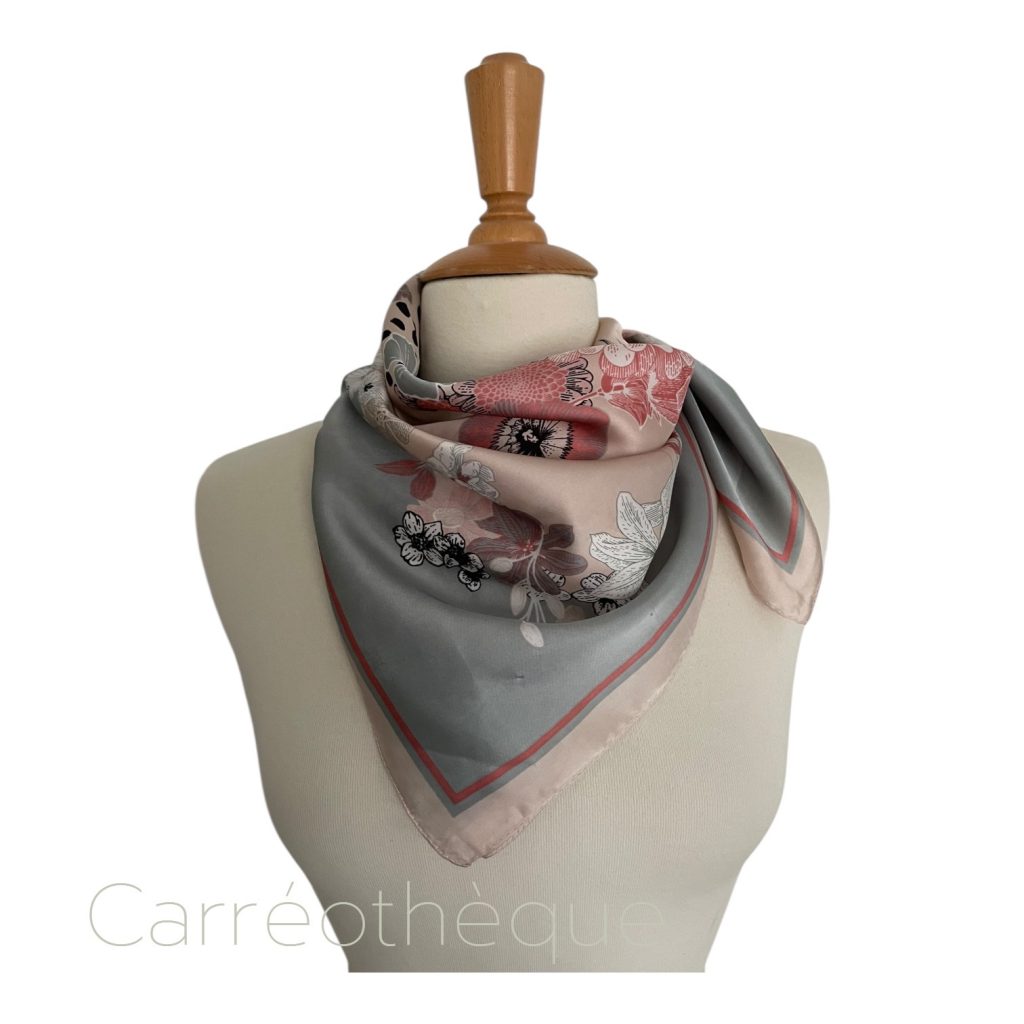 Carré 70 motif dessin botanique fleurs pastel harmonie rose et gris, doux et féminin.