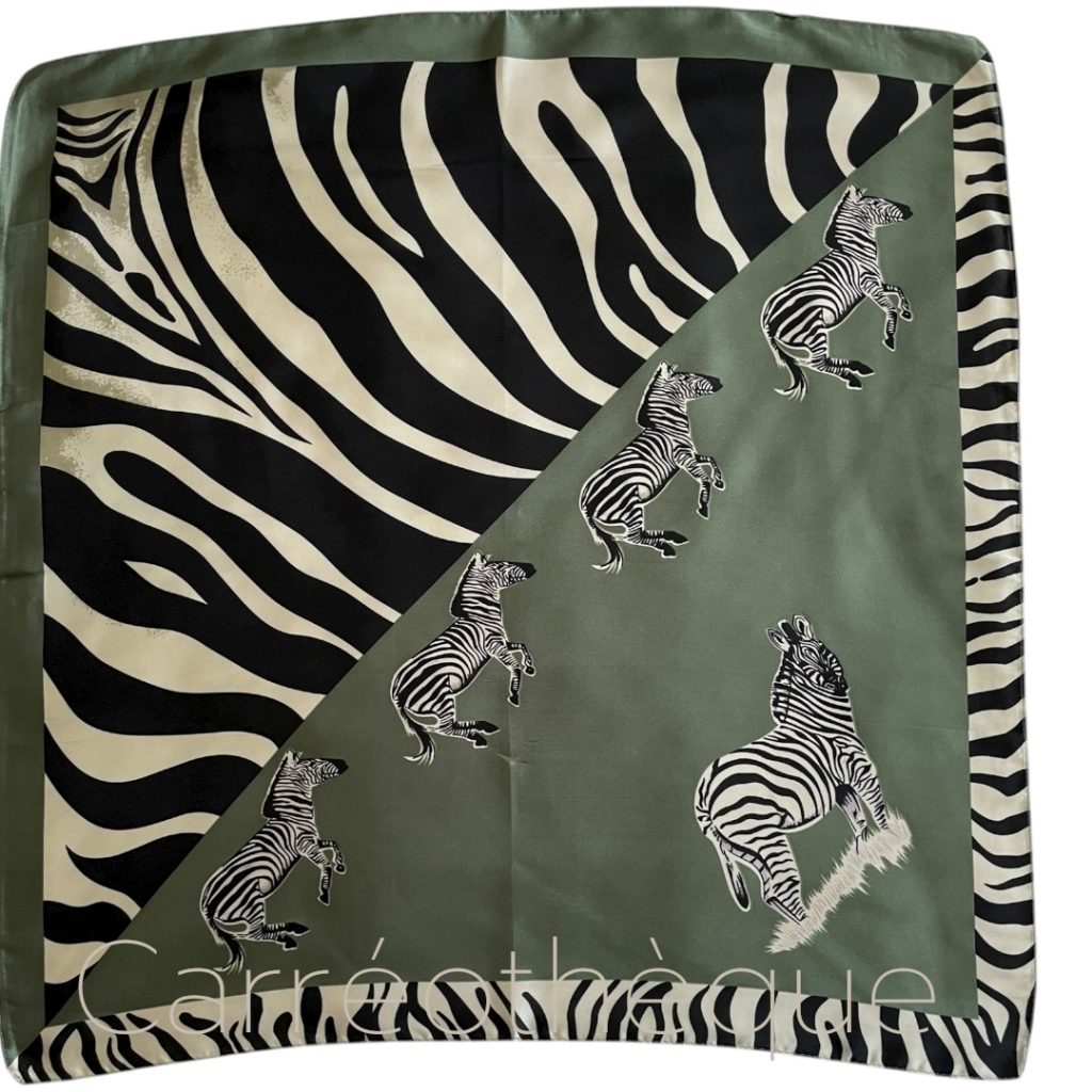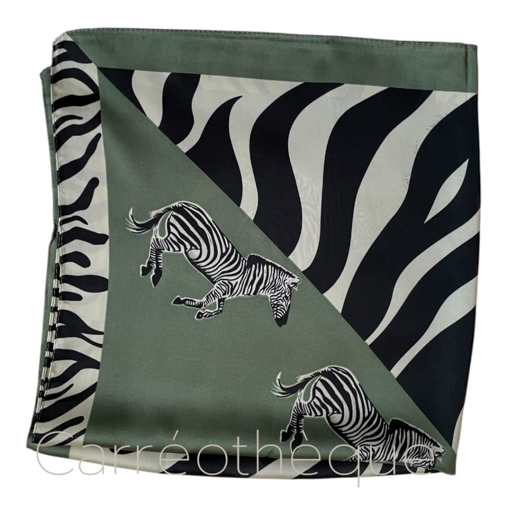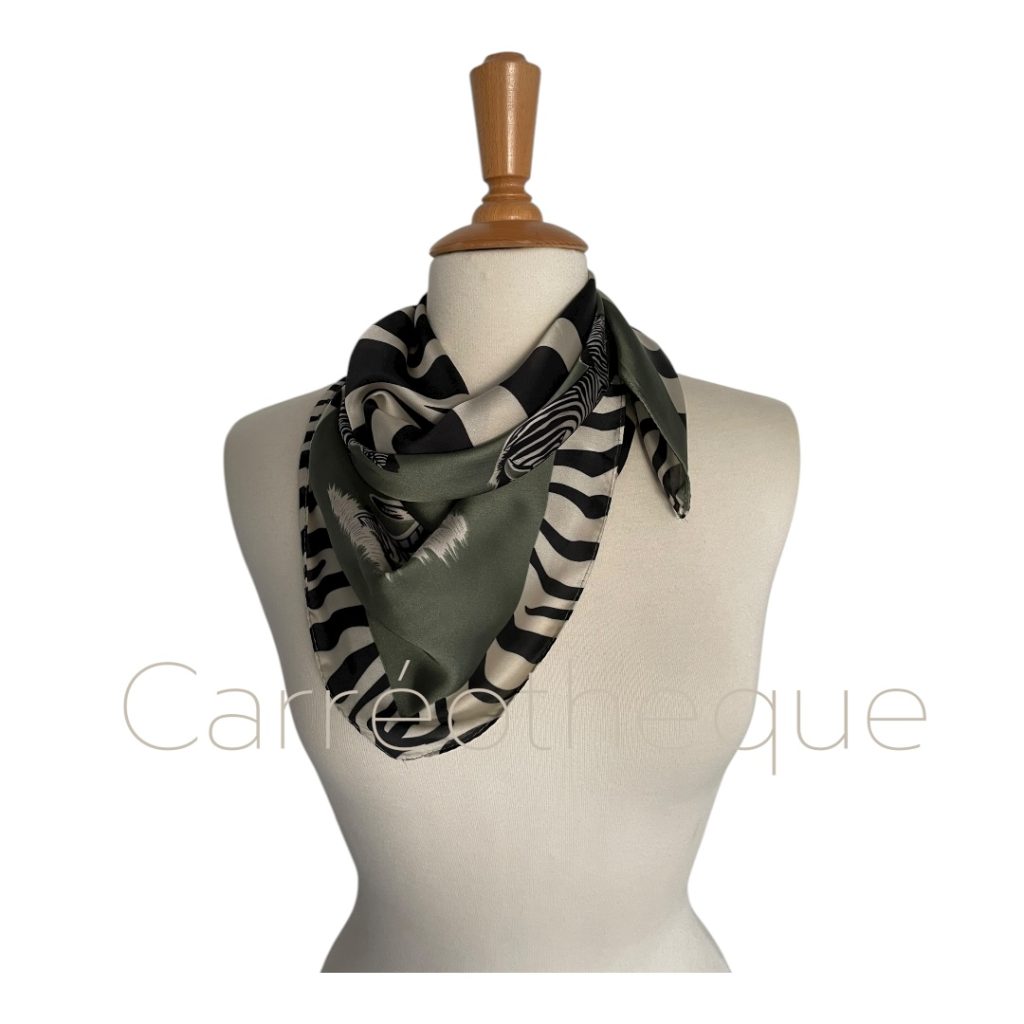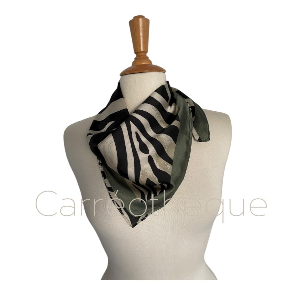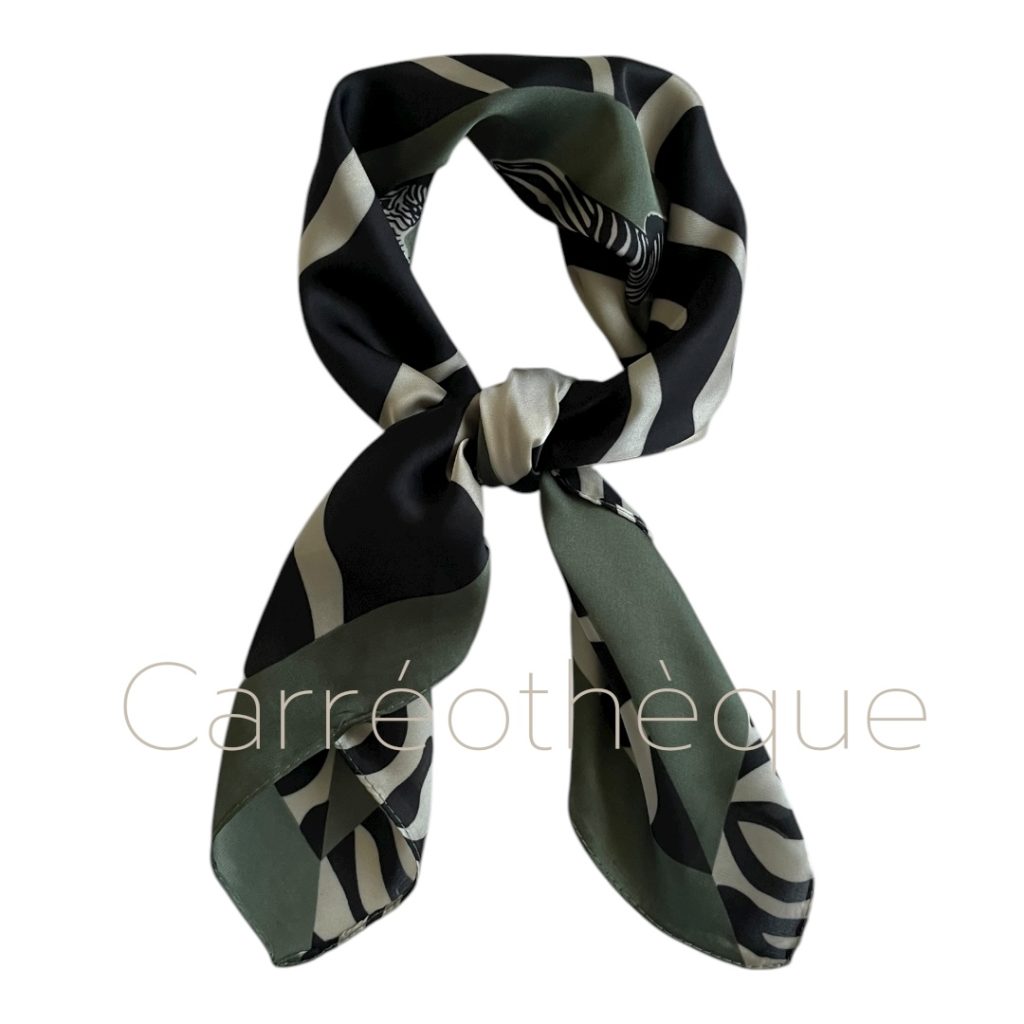 Carré 70 motif animal zèbre kaki noir, féminin et moderne.