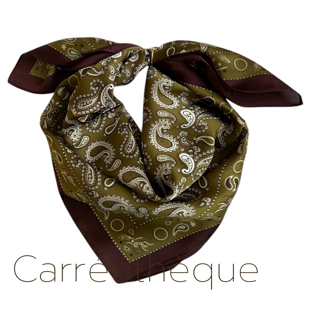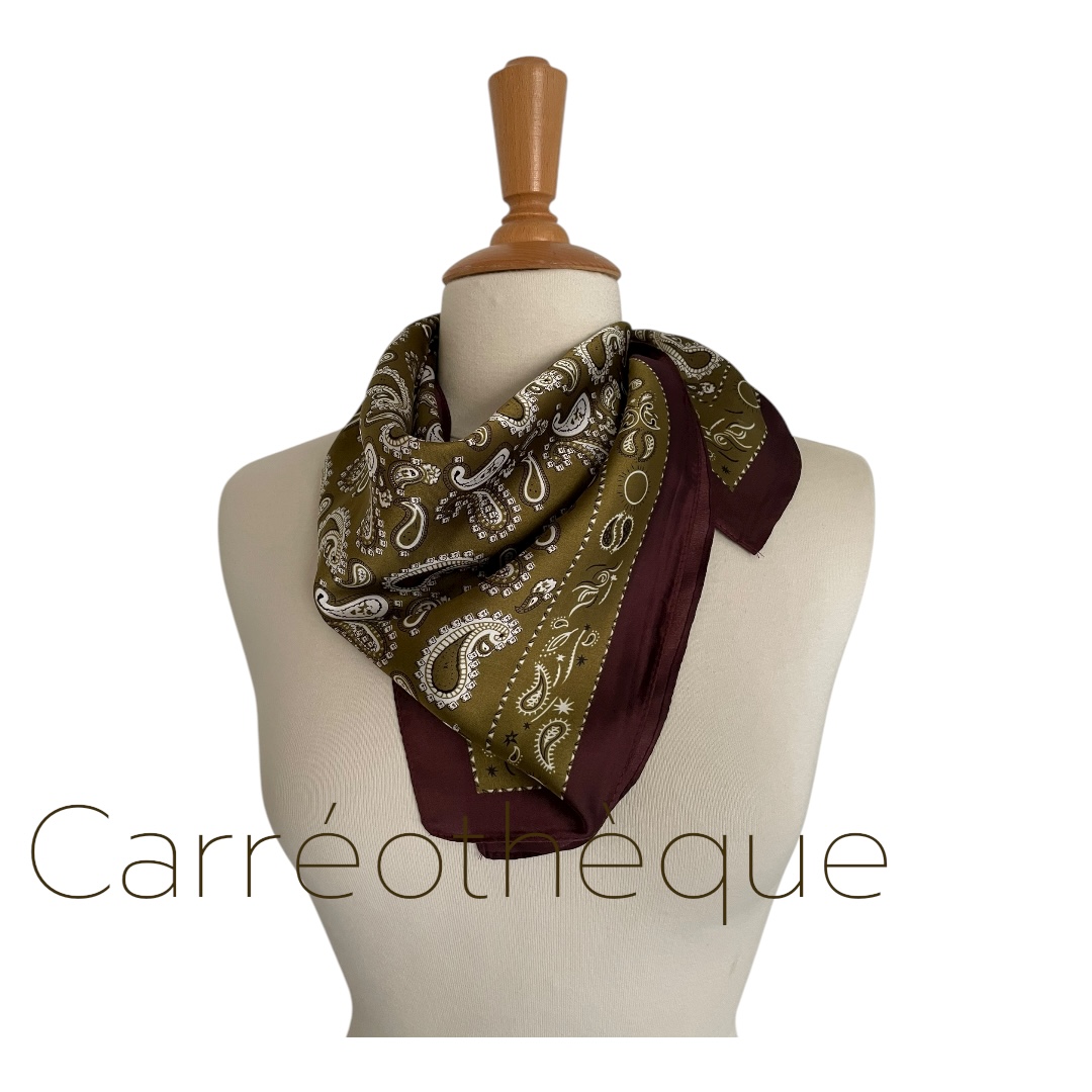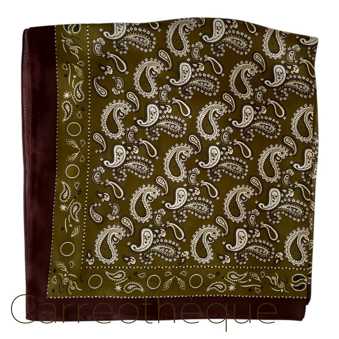 Carré 70 motif cachemire kaki tour bordeaux. Mixte intemporel.