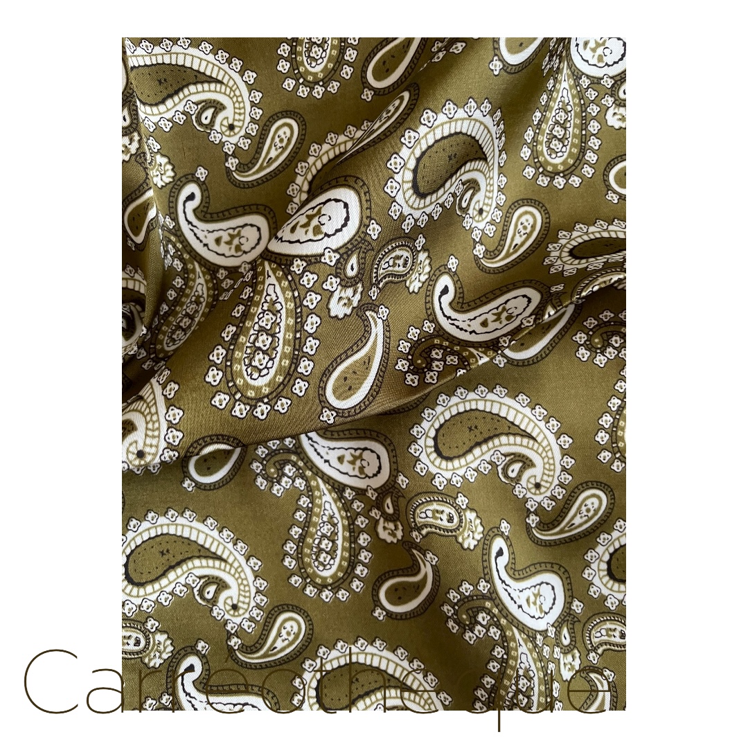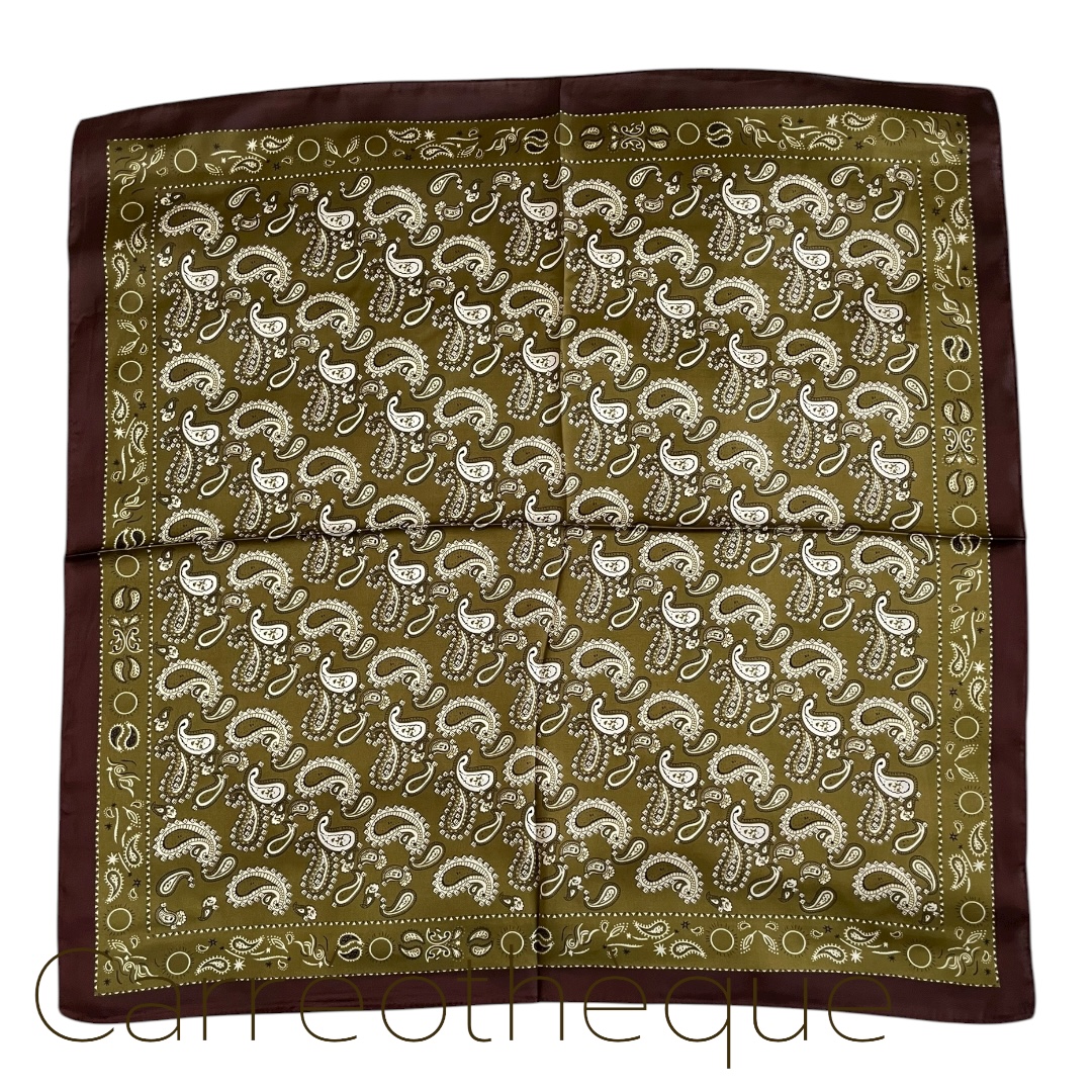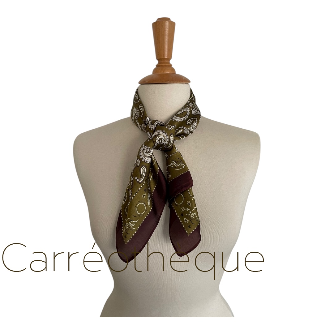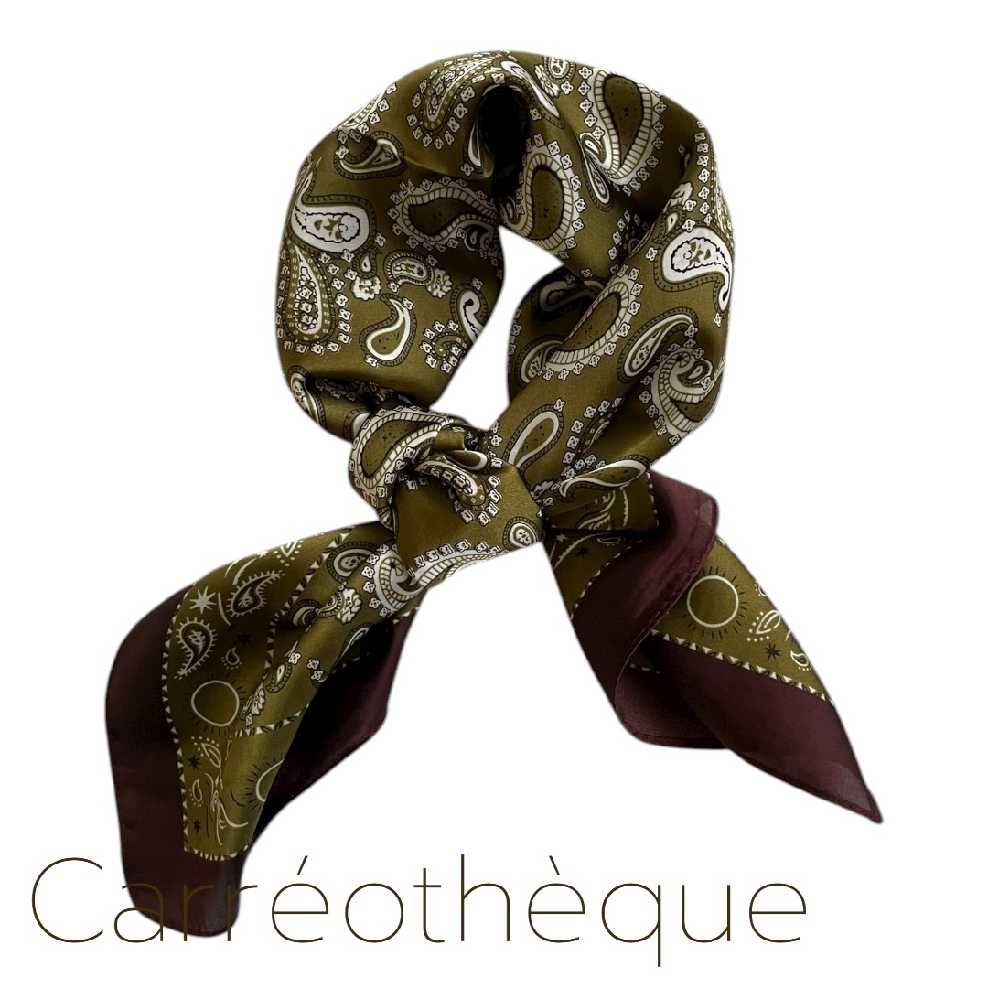 Carré 70 motif cachemire kaki tour bordeaux. Mixte intemporel.