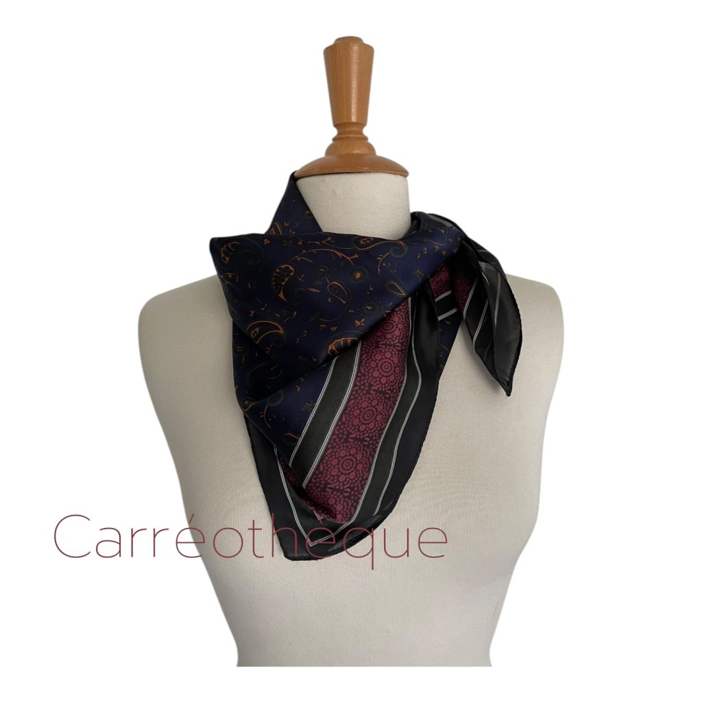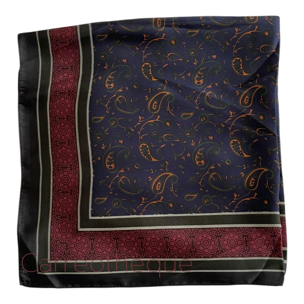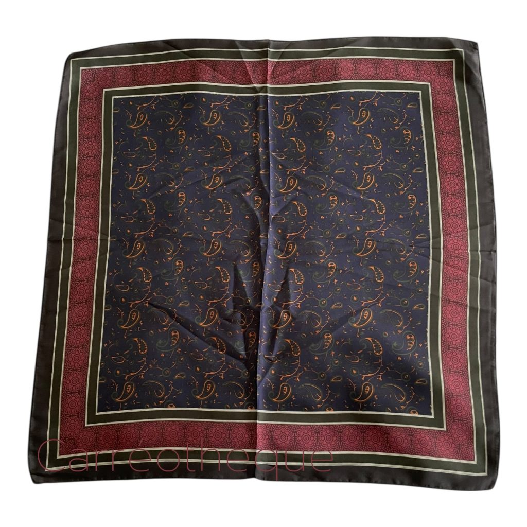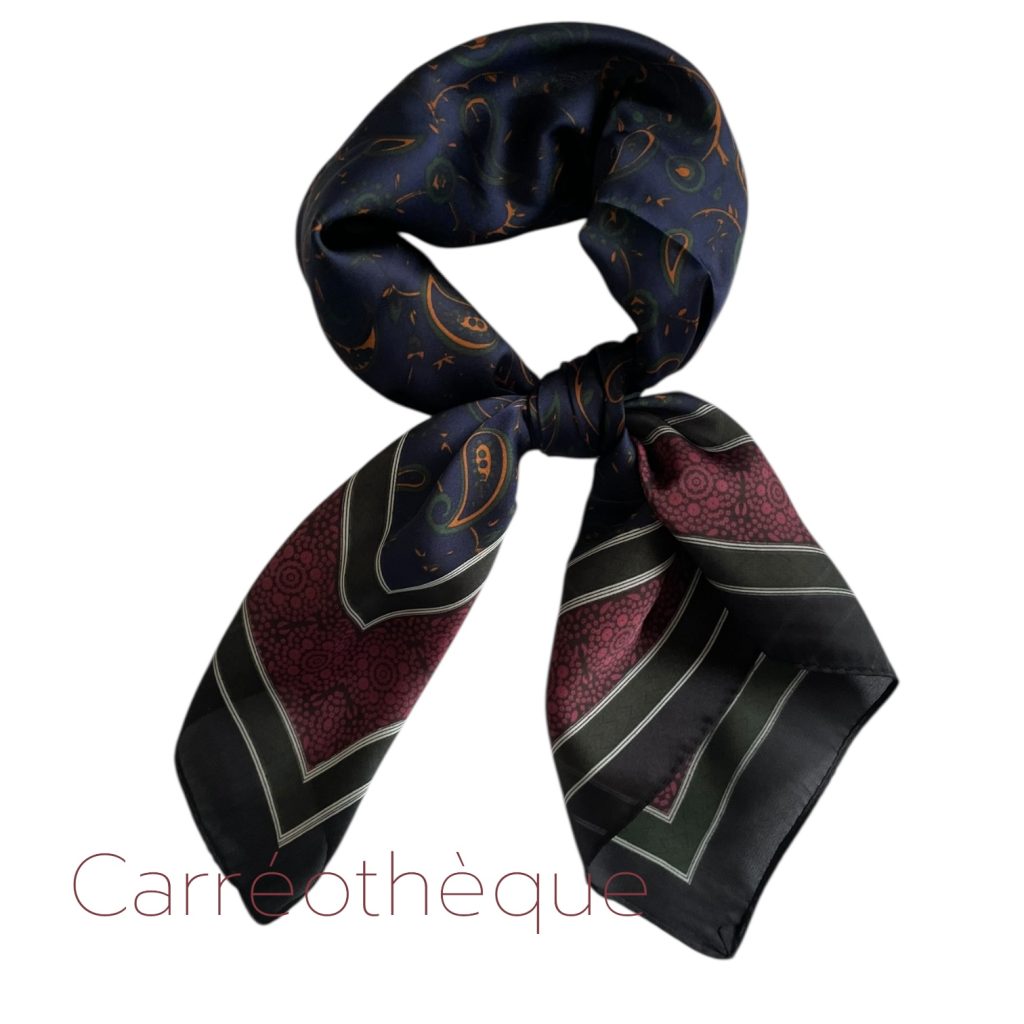 Carré 70 motif cachemire marine bordeaux, touche de moutarde et vert foncé. Coloris intenses rares pour un foulard au motif cachemire dont les fonds sont souvent plus clairs. Mixte intemporel.
