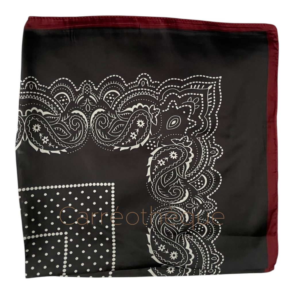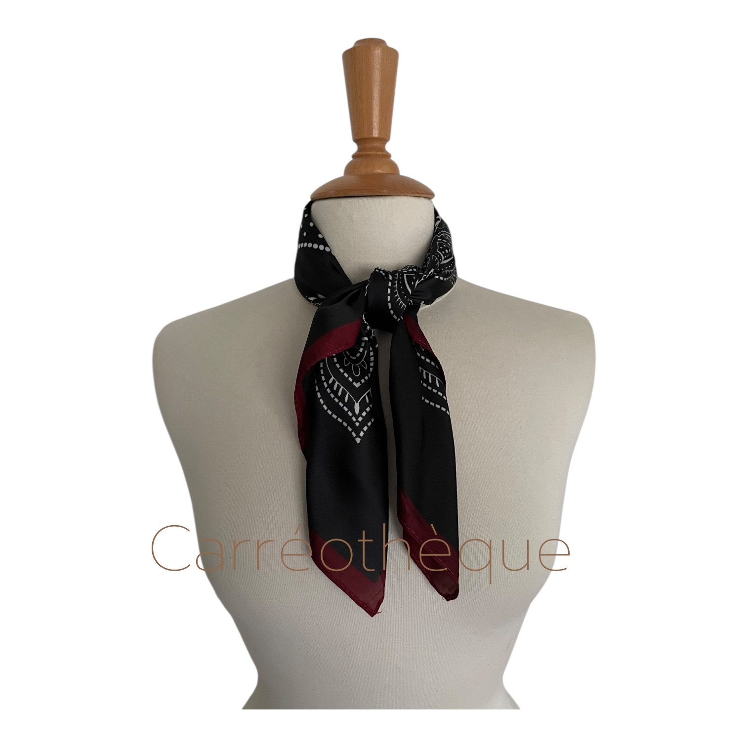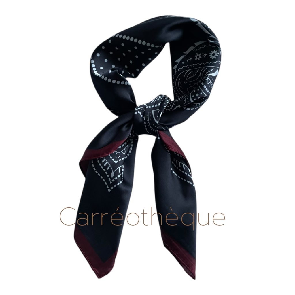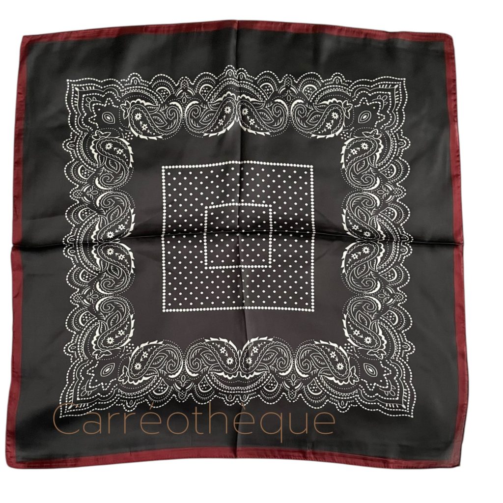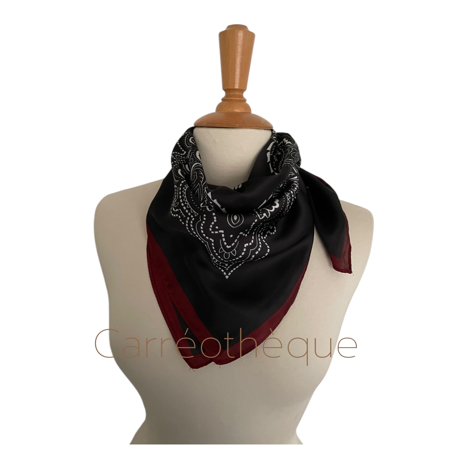 Carré 70 motif cachemire noir tour bordeaux dessin blanc crème