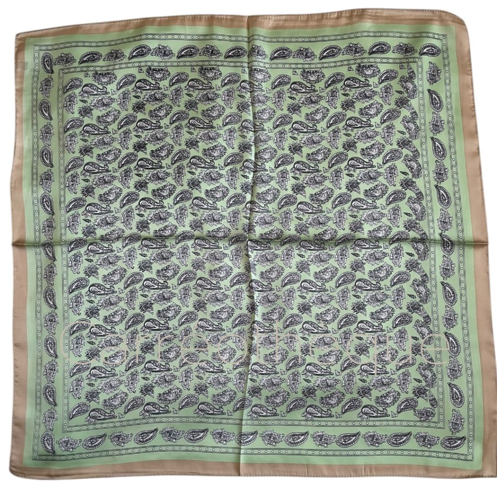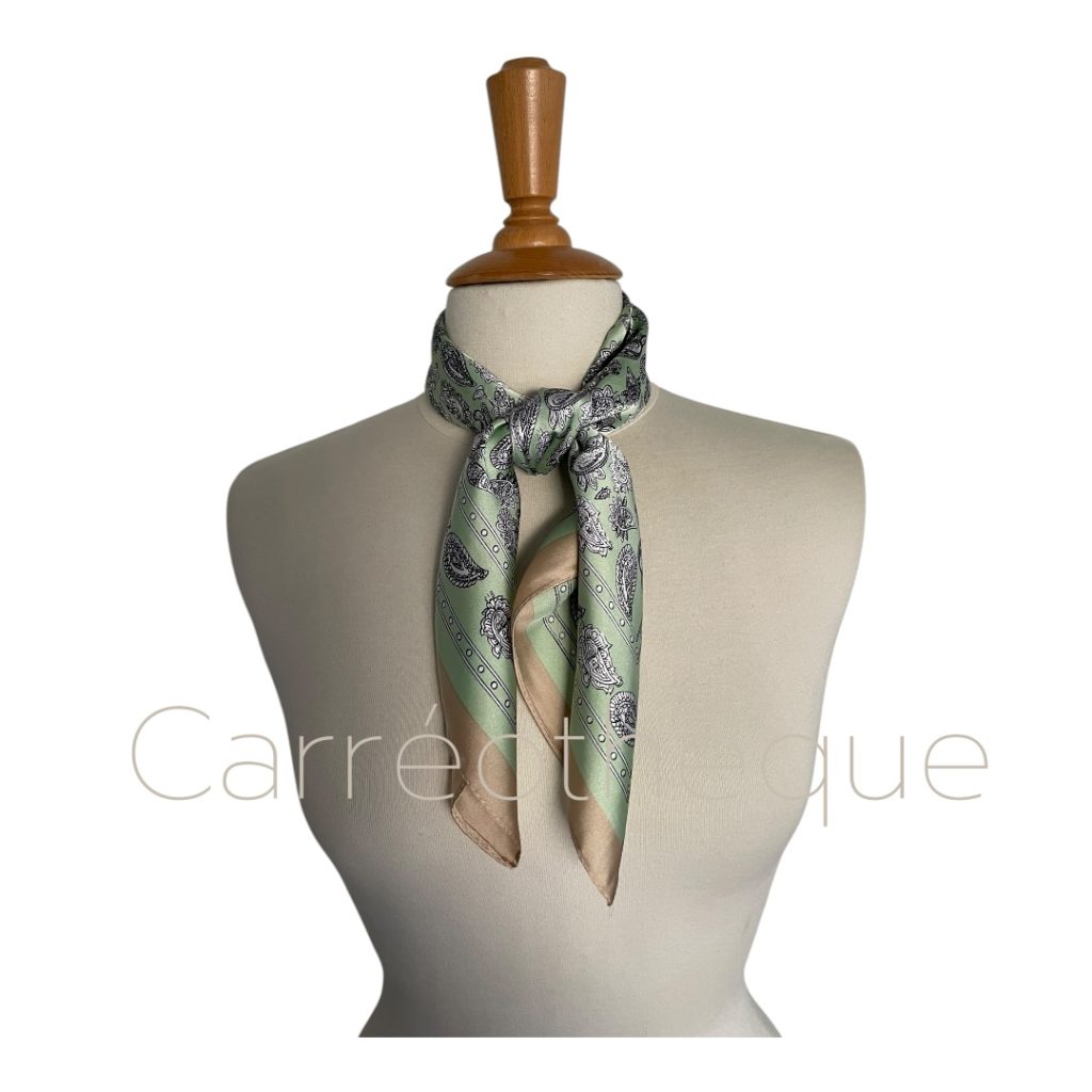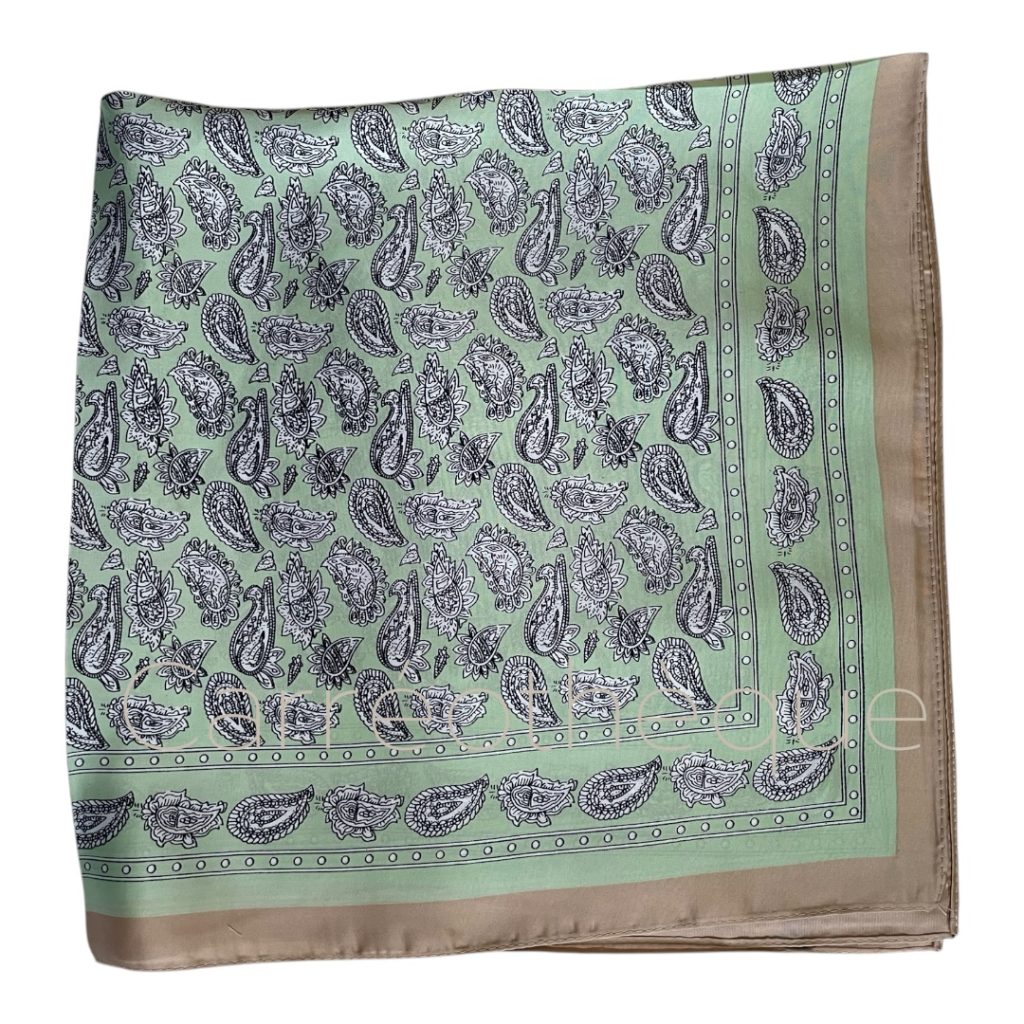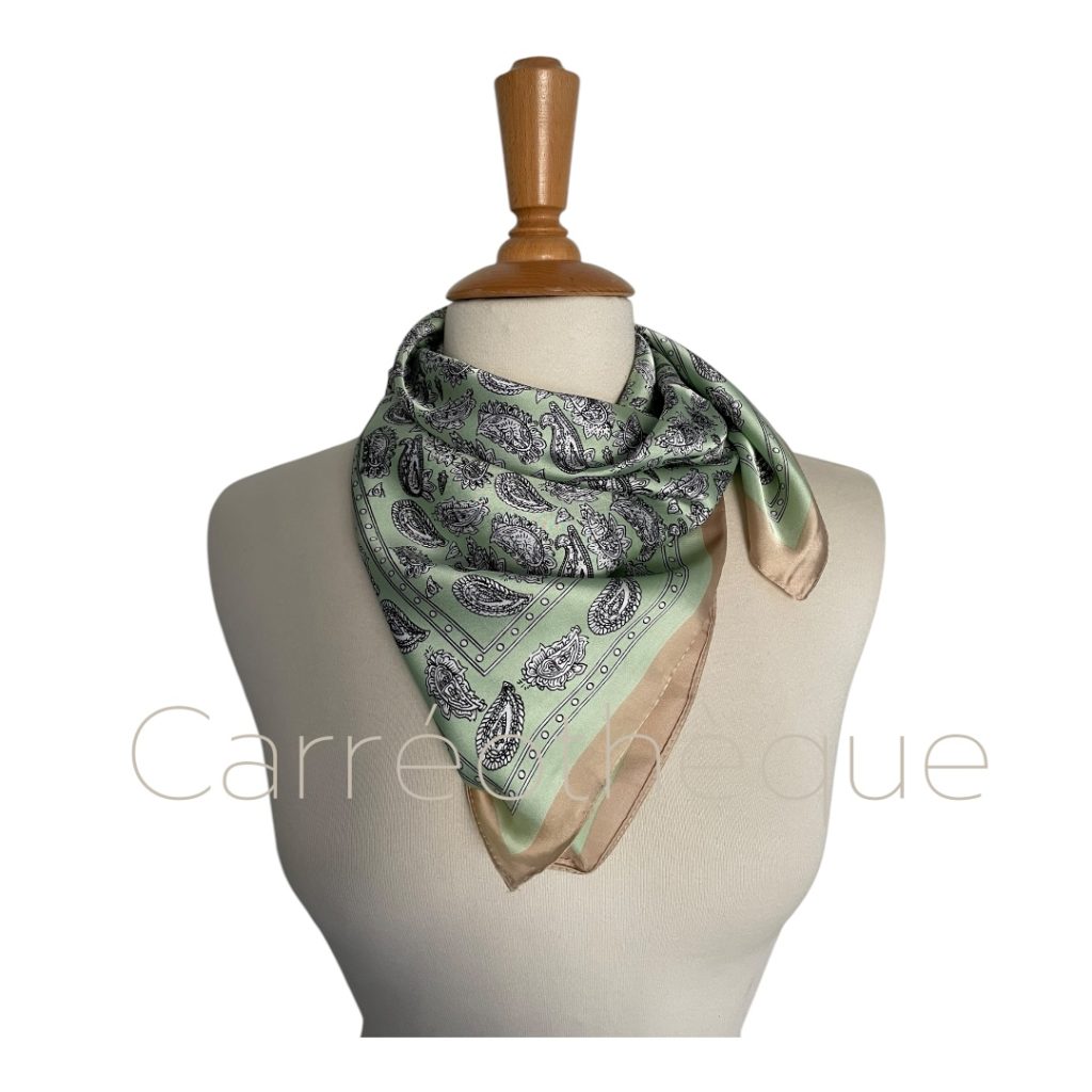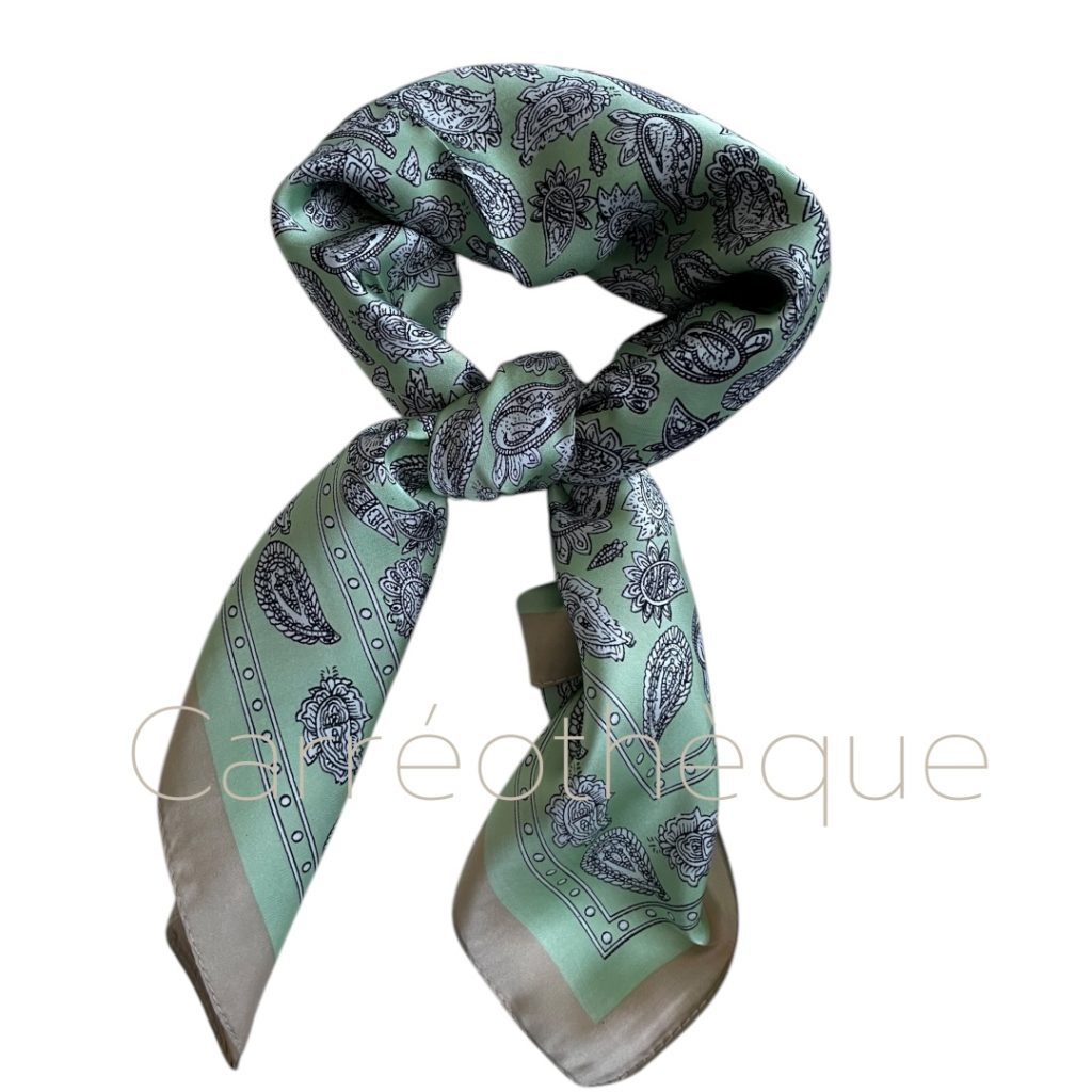Carré 70x70cm motif cachemire vert pastel tour beige.