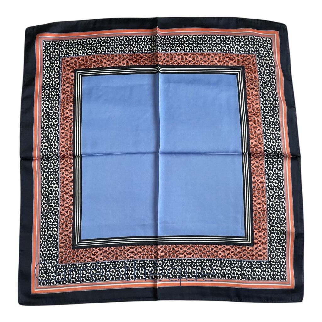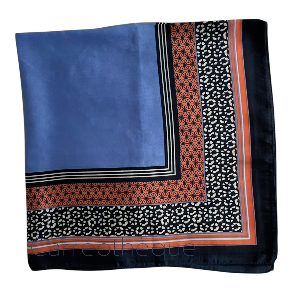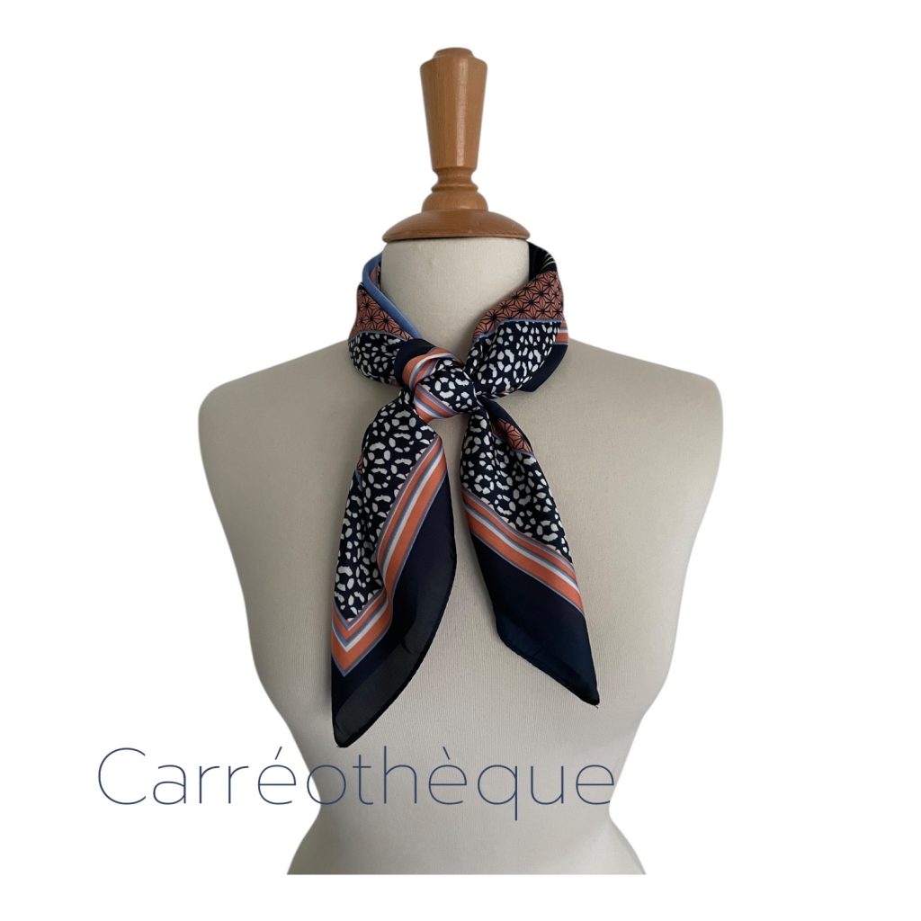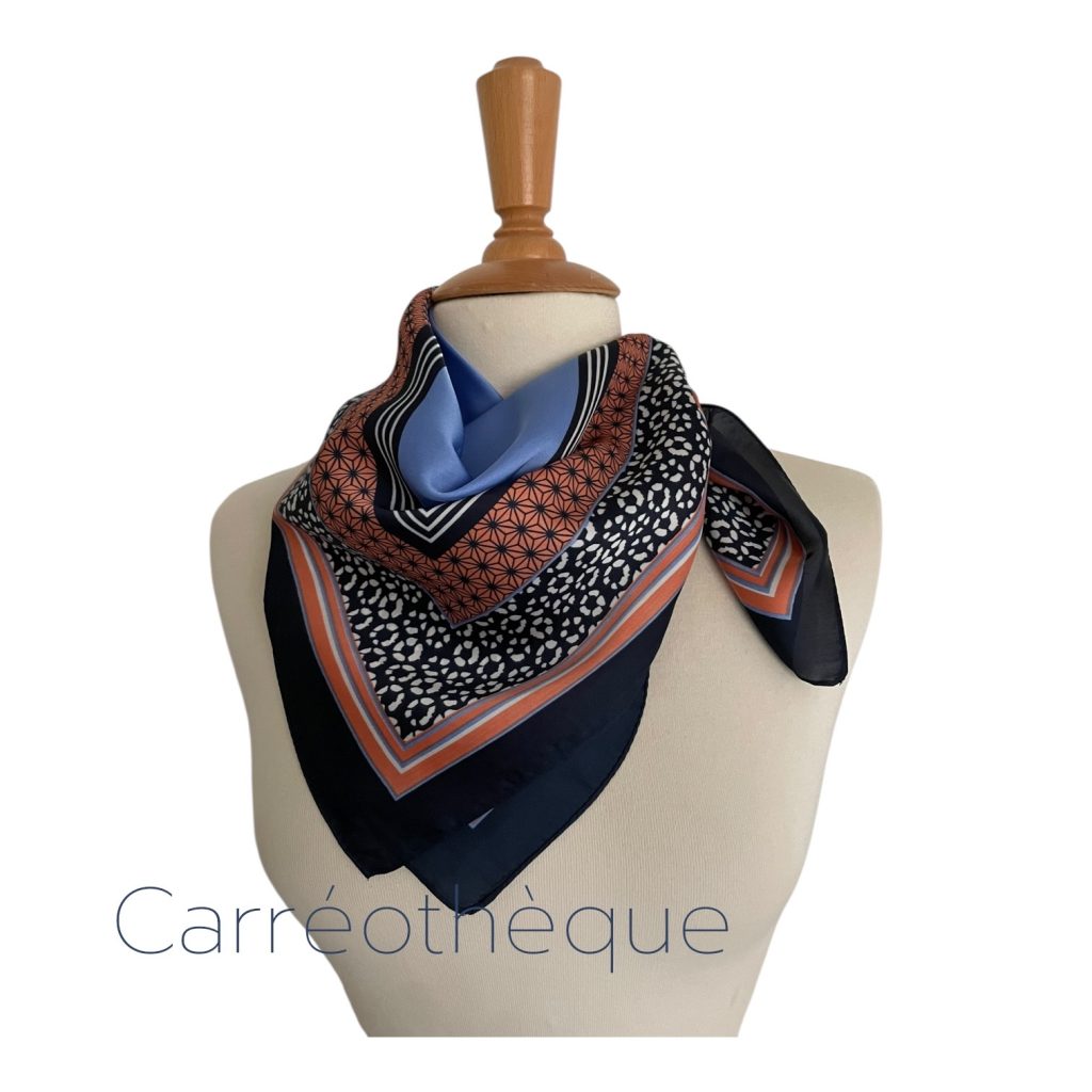 Carré 70 petit motif géométrique bleu, marine et rose corail.